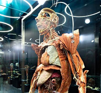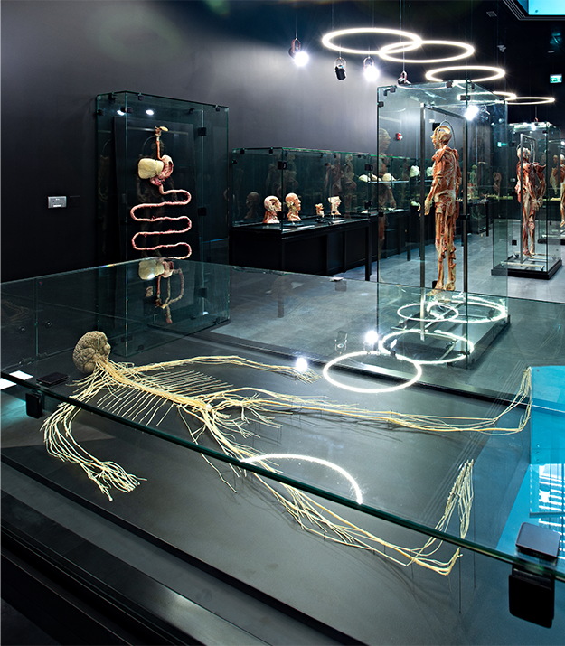 The permanent exposition of dissected human bodies focuses on presenting both regional and systems-based anatomy in healthy adult individuals. There is also a dedicated section highlighting the effects of lifestyle diseases and pathological processes on human organs.