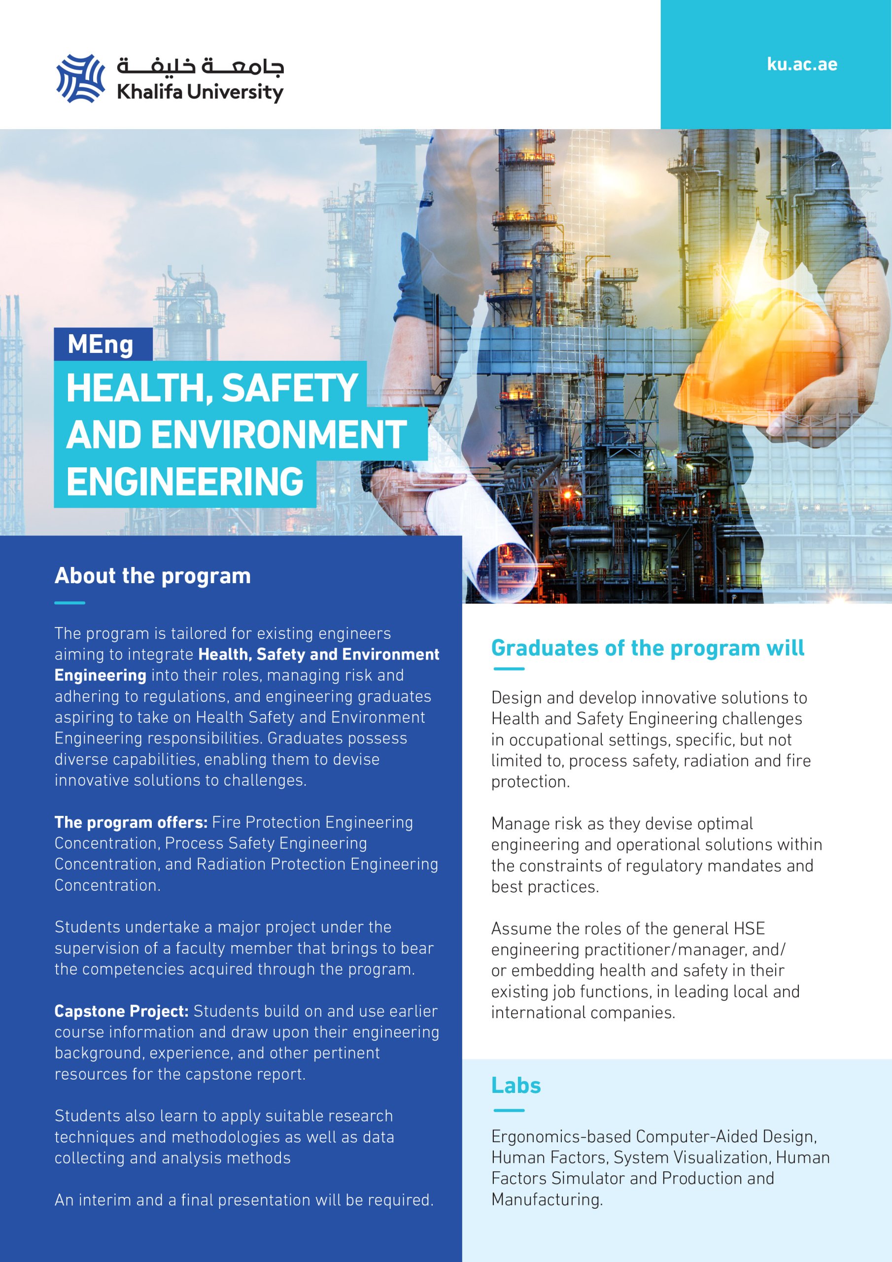 The Master of Engineering in Health, Safety and Environmental Engineering (HSEG) program aims to produce graduates with the disciplinary preparation and ability to design and develop innovative solutions to Health and Safety Engineering challenges in occupational settings, specific, but not limited to, process safety, radiation and fire protection. They manage risk as they devise optimal engineering and operational solutions within the constraints of regulatory mandates and best practices. HSEG graduates are currently assuming roles of the general HSE engineering practitioner/manager, and/or embedding health and safety in their existing job functions, in leading local and international companies; including ADNOC.