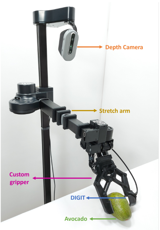 Avocado Ripeness Prediction Stretch Robot Setup. The robot, equipped with tactile sensors, grasps the fruit, picks it, and simultaneously predicts its ripeness using an AI model. The robot then moves to the designated ripeness bin position (Ripe, Overripe, and Underripe) before placing the fruit inside.