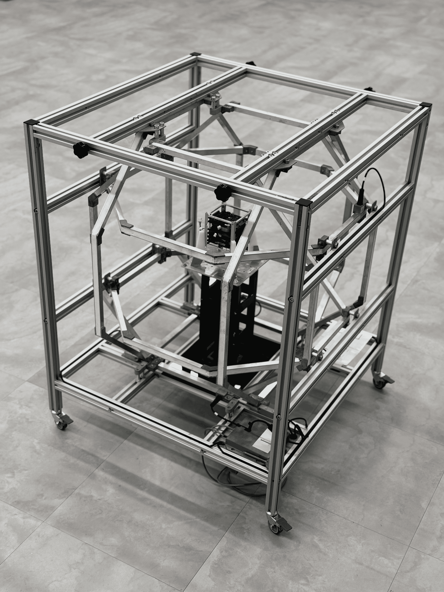 The ADCS test setup at KUSTIL comprises the essential equipment and structural components required for the development and test of Attitude Determination and Control Systems (ADCS). The facility includes a Helmholtz cage test rig capable of accommodating satellites up to 27U in size, as well as an air bearing platform and a magnetic levitation system, all designed to support the evaluation of integrated and developed ADCS solutions.