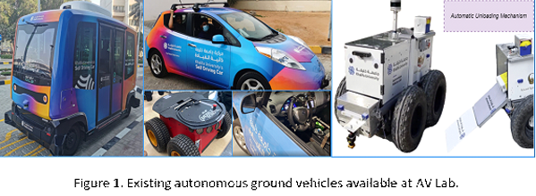 In this project, reasoning under both aleatoric and epistemic uncertainty, we seek to design a proof-of-concept Multi-robot Symbiotic Autonomy Platform (MSAP) and synthesize provably efficient controllers and algorithms for safety-critical applications in transportation and last-mile logistics. Existing abstraction methods fail to achieve this novel and general objective. We target to deploy the developed MSAP at Khalifa University’s (KU) SAN campus, thereby positioning KU as the first university in the region with a next-generation Intelligent Campus. Specifically, capitalizing on the infrastructure and equipment already in place at KU’s Autonomous Vehicle Lab (AV Lab), which appear in Figs. 1 and 2, and include autonomous shuttle service at the SAN campus, contactless robotic delivery vehicle, retrofitted autonomous Nissan Leaf car, legged robot, robotic arm and four drones, we seek to develop an MSAP operating system that allows users to avail the following use cases: