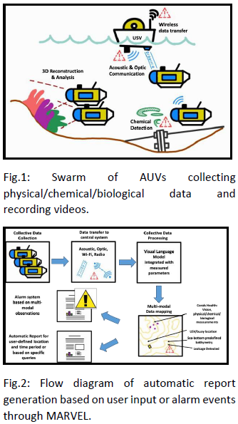 This DSUF proposal aims to revolutionize underwater maritime monitoring, developing the MARVEL framework: Maritime Advanced Robotics, Vision, Efficiency, and Learning. MARVEL integrates underwater multi-robot autonomous systems (underwater swarm) with visual language models (VLM) and multimodal AI to allow wide areas of monitoring in the underwater environment. In particular, the collaboration among many autonomous underwater vehicles (AUVs) enables the assessment of water quality and environmental health, producing 3D mapping of main physical and chemical environmental parameters. Advanced computer vision models allow online and offline observation of marine life, particularly coral reefs, and man-made structures like aquaculture farms, oil and gas facilities, and ports.
