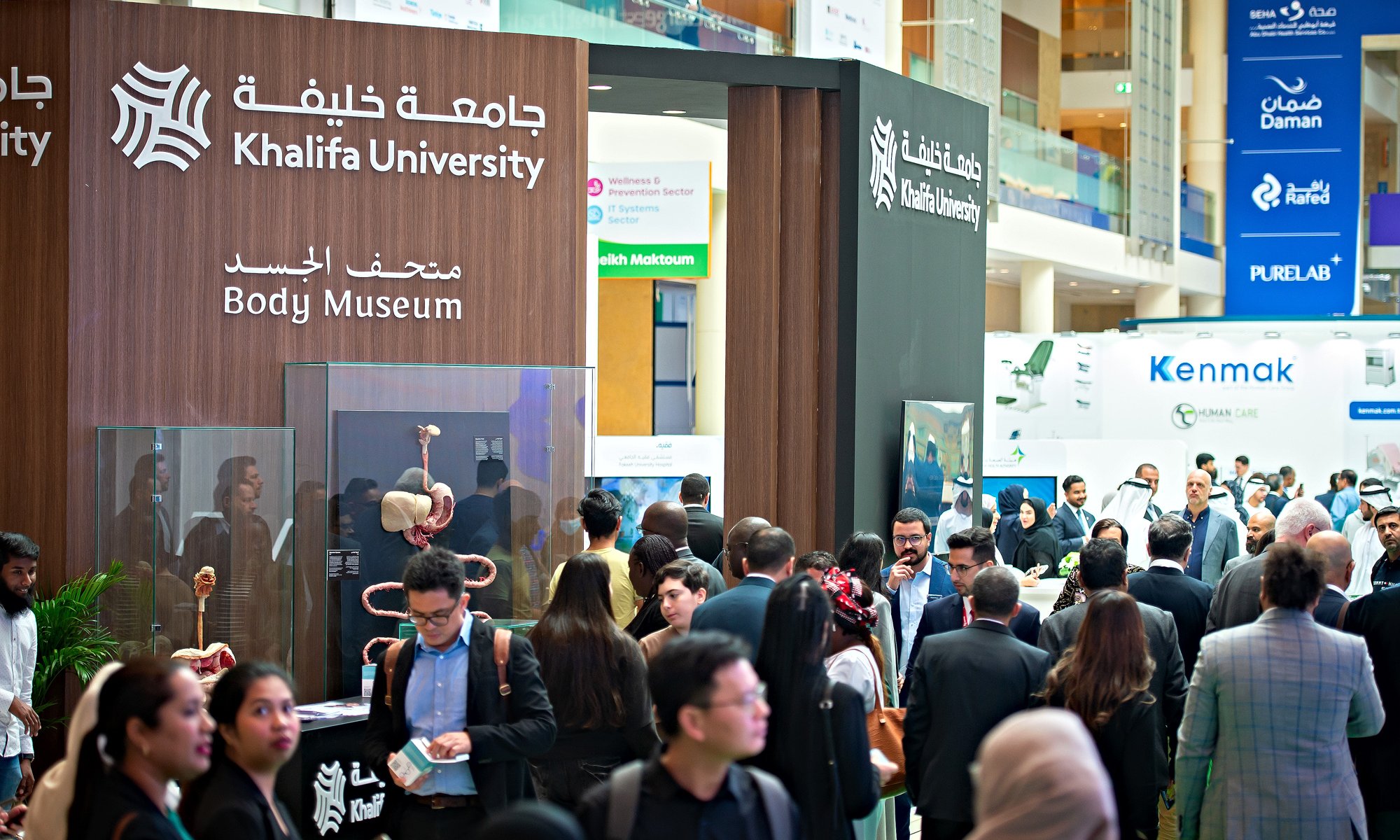 Khalifa University presented a flexible hydrogel base electrode that can record electrophysiology signals, a novel 3D printed prototype of human knee femoral component, and a custom, easy-to-use, air pressure-powered, single-nozzle frugal 3D bio-printer capable of fabricating artificial tissues and organoids in the lab that can also be used in research. In addition, Swift Biomed, a startup from Khalifa Innovation Center (KIC) that aims to develop compact, portable and rapid diagnostics devices for detection of infectious diseases, was showcased at the event. Also at the stand was a virtual tour of the Body Museum by Body Worlds, which explores how disease and aging affect the human body.