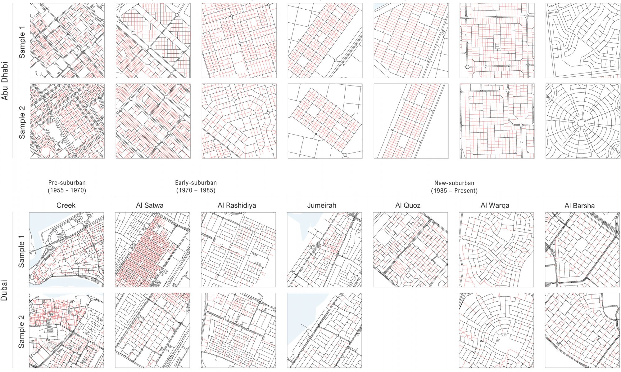“The urbanization and suburbanization trends, along with the resulting development of different neighborhood forms in the UAE, were imported from Western countries,” Dr. Alawadi said. “Both cities have a history of inviting and hiring consulting firms and foreign architects who were all trained in Western countries. The grids and fragmented layouts that comprise the diverse set of neighborhoods in Abu Dhabi and Dubai are the same applied in city planning around the world.”